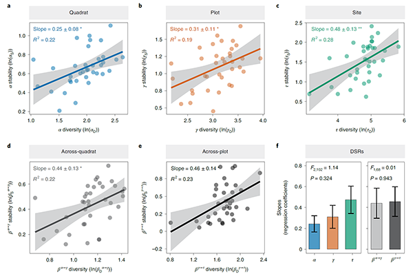 图2. 不同尺度的多样性-稳定性关系(A-E)、以及这一关系的强度随空间尺度的变化(F)。