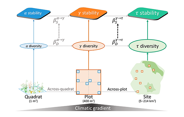 发布时间:2022-09-20自然生态系统为人类社会提供了多种功能和服务。在全球变化背景下,维持生态系统的稳定性成为可持续发展的关键目标之一。很多研究表明,多样性越高的生态系统具有更大的稳定性。虽然“多样性-稳定性”理论自1990年代以来日趋成熟,但以往研究主要关注小尺度实验群落,关于这一理论能否扩展至大尺度自然群落仍不清楚。为了理解这一问题,北京大学必赢766net手机版王少鹏研究组自2014年以来开展了一系列理论工作,提出并发展了多尺度稳定性理论框架,基于这一理论框架预测局域群落间的物种组成差异(即β多样性)可促进区域尺度生态系统的稳定性。针对这一理论框架,近期多项研究利用单个站点的植物群落实验数据做了检验,但跨区域的大尺度经验证据依然缺乏。